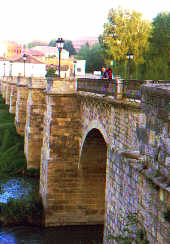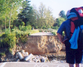 Der Tag hat schon in der Frühe zwei Überraschungen. Einmal ist es die überwältigende Größe und die "Kunst am Bau" des Klosters San Zoilo gleich nach Überquerung des Rio Carrión. Dann der Hinweis, dass die Straße gesperrt ist - außer für Pilger (!). Des Rätsels Lösung war, dass die starken Regenfälle im Frühjahr die Brücke weggespült hatten! Für die Pilger gab es eine kleine Behelfsbrücke. |