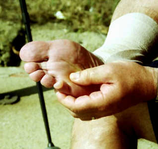 Eine Blase am kleinen Fußzeh! Trotz "Anstechen" und Wollfaden durchziehen ist sie - ohne Probleme zu machen - bis nachhause erhalten geblieben. Allerdings Fußgelenk bandagiert. |