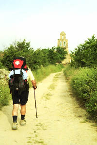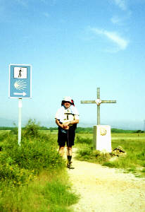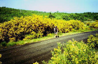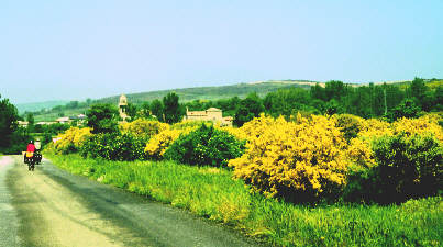 Gut ausgeruht verlassen wir Astorga früh beim ersten Büchsenlicht. Der Ruhetag hat gut getan. Kurz hinter der der modernen Kiche St. Pedro gesellt sich ein großer Golden Retriever - ähnlicher Hund zu uns. Andere Pilger, die wir überholen oder die uns überholen beachtet er nicht - er hat sich uns ausgesucht. Wenn wir stehen bleiben oder ihn zur Umkehr bewegen wollen, legt er sich einfach hin. Essen nimmt er von uns armen Pilgern nicht an. So laufen wir ca. 12 km zusammen, bis er dann unvermittelt zu einem einsam gelegenen Hof abbiegt. Ansonsten haben heute vor allem die riesigen Ginsterbüsche beeindruckt, die sich in voller Blüte zeigen. |