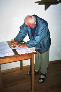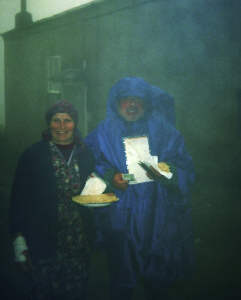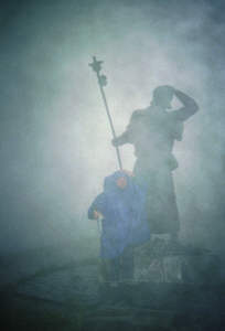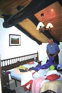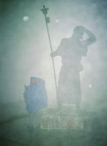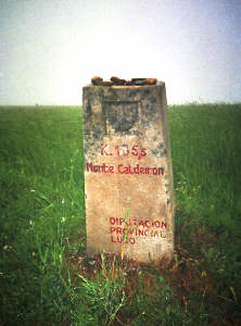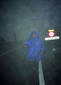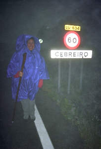 Heute ist Sonntag - zuhause würden wir noch mindestens 3 Stunden im Bett liegen. Hier auf dem O´Cebreiro ist es noch stockfinster als wir aufstehen und den Rucksack packen. Unser Thermometer, dass wir außen auf die Fensterbank gelegt hatten, zeigt gerade mal 4 Grad an - im Juni in Spanien! Dazu regnet es sehr stark und die Wolken haben O´Cebreiro eingehüllt, Sicht gleich null und der Wind bläst in Sturmstärke. Also vom Start weg pilgern mit Anorak und Regencape. Es ist uns heute wirklich schwer gefallen, vor die Haustüre zu treten. Dazu ohne Frühstück! |