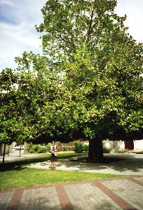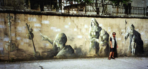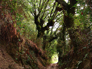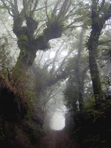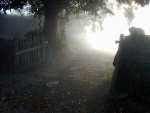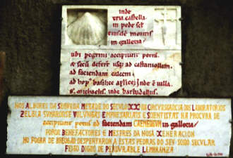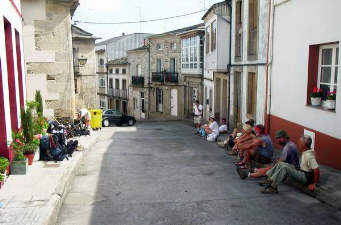 Gleich früh, vor einem richtigen Frühstück, wird uns Pilgern eine Entscheidung abverlangt: gehen wir die längere, kunsthistorisch interessantere Strecke über das Kloster Samos (könnten wir später mal mit dem Auto besuchen?) oder die kürzere, klassische und landschaftlich schönere Route über Calvor nach Sarria. Nach dem schweren gestrigen Tag wollen wir heute das schöne Wetter genießen und wählen die kürzere Strecke, die uns in steilem Auf und ab teilweise wildromanisch durch die Berglandschaft Galiciens führt. Leider haben wir hierzu keine eigenen Bilder - in Sarria wollen wir versuchen, einen Photoapparat zu kaufen. |