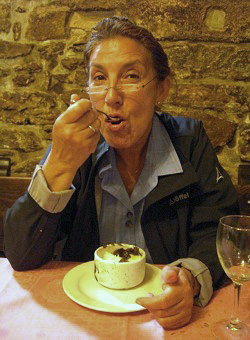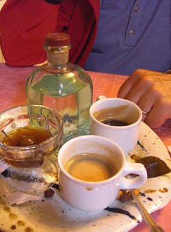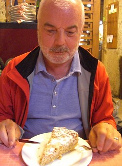 Mittagessen, dann "tarta de Santiago", cafe con leche und Orujo!!! |
