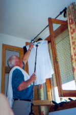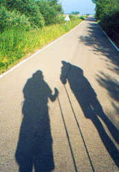 An das Aufstehen lange vor Sonnenaufgang haben wir uns mittlerweile gewöhnt, denn nur so können wir im ersten "Büchsenlicht" jeden Tag in der Frische des Morgens los laufen. Die Puppe Pippi Langstrumpf, die wir gefunden hatten, thront oben auf Ritas Rucksack im Sonnenschein, denn wir laufen wie jeden Tag unserem Schatten hinterher. |