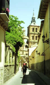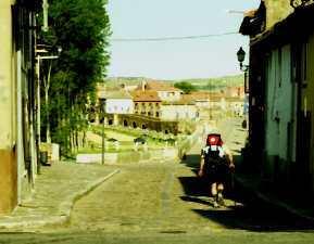 Heute ist es wieder sehr heiß und nach 12 km ist unser Wasservorrat aufgebraucht. Aber eine hilfsbereite Einwohnerin von Hospital de Orbigo versorgt uns mit frischem Wasser. Lästig sind die Pappelblüten, die in riesigen Wolken umher fliegen und eingeatmet werden. Beim Crucero de S. Toribio sieht man schön hinab auf Astorga - Rita ruft zuhause an und meint, dass wir gleich in Astorga sind. Aber die 5 km bedeuten halt immerhin noch über eine Stunde laufen. |