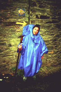 Heute ist Sonntag - zuhause würden wir noch mindestens 3 Stunden im Bett liegen. Hier auf dem O´Cebreiro ist es noch stockfinster als wir aufstehen und den Rucksack packen. Unser Thermometer, dass wir außen auf die Fensterbank gelegt hatten, zeigt gerade mal 4 Grad an - im Juni in Spanien! Dazu regnet es sehr stark und die Wolken haben O´Cebreiro eingehüllt, Sicht gleich null und der Wind bläst in Sturmstärke. Also vom Start weg pilgern mit Anorak und Regencape. Es ist uns heute wirklich schwer gefallen, vor die Haustüre zu treten. Dazu ohne Frühstück! |
