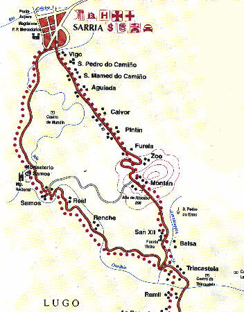 Gleich früh, vor einem richtigen Frühstück, wird uns Pilgern eine Entscheidung abverlangt: gehen wir die längere, kunsthistorisch interessantere Strecke über das Kloster Samos (könnten wir später mal mit dem Auto besuchen?) oder die kürzere, klassische und landschaftlich schönere Route über Calvor nach Sarria. Nach dem schweren gestrigen Tag wollen wir heute das schöne Wetter genießen und wählen die kürzere Strecke, die uns in steilem Auf und ab teilweise wildromanisch durch die Berglandschaft Galiciens führt. Leider haben wir hierzu keine eigenen Bilder - in Sarria wollen wir versuchen, einen Photoapparat zu kaufen. |